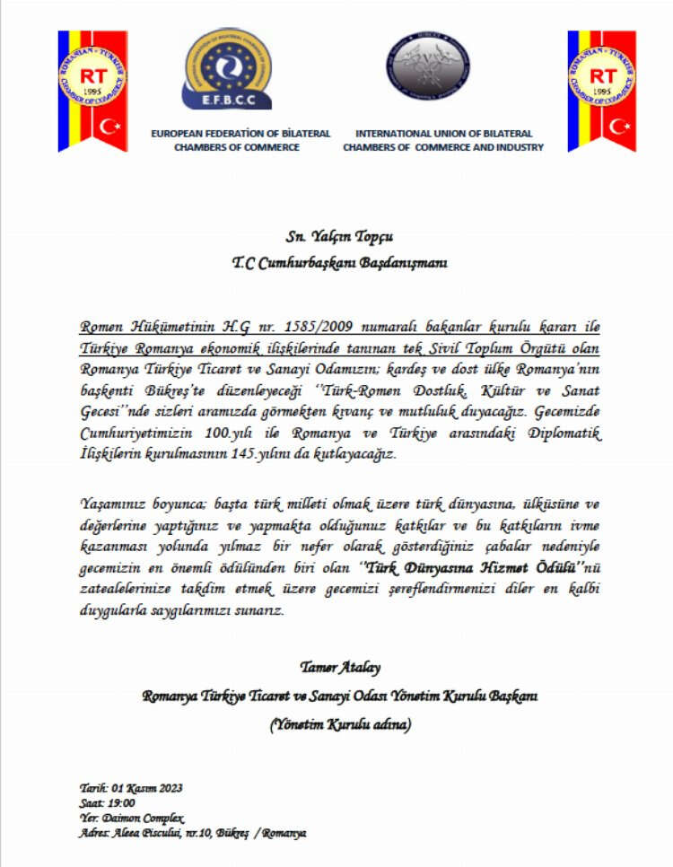 Türkiye Cumhurbaşkanı Başdanışmanı Yalçın Topçu, Romanya Türkiye Ticaret ve Sanayi Odası tarafından 1 Kasım 2023 tarihinde Bükreş’te düzenlenen Cumhuriyetin 100. Yılı ile Romanya ve Türkiye arasındaki Diplomatik İlişkilerin kurulmasının 145. Yılının kutlanacağı Türk-Romen Dostluk, Kültür ve Sanat Gecesi’nde kendisine verilecek “Türk Dünyasına Hizmet Ödülü” almak için Romanya’ya hareket etmeden önce açıklama yaptı.