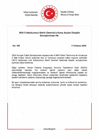 UEFA, oyuncu Merih Demiral hakkında yaptığı bozkurt işaretinden dolayı soruşturma açtı. UEFA şu açıklamada bulundu: “Almanya'nın Leipzig şehrinde 2 Temmuz 2024 tarihinde Avusturya ile Türkiye arasında oynanan 2024 UEFA Avrupa Şampiyonası Son 16 Turu maçı ile ilgili olarak, Türkiye Futbol Federasyonu oyuncusu Merih Demiral'ın uygunsuz davranışı iddiasıyla ilgili olarak UEFA Disiplin Yönetmeliği'nin 31'inci maddesinin 4'üncü fıkrası uyarınca soruşturma açılmıştır. Konuyla ilgili daha fazla bilgi zamanı gelince sunulacaktır.”
