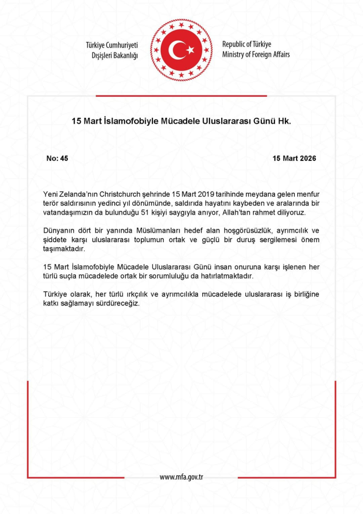 Bakanlığın 15 Mart 2026 tarihli ve 45 numaralı açıklamasında, Yeni Zelanda’nın Christchurch kentinde 15 Mart 2019’da gerçekleştirilen terör saldırısının yedinci yıl dönümünde, aralarında bir Türk vatandaşının da bulunduğu 51 kişinin saygıyla anıldığı ve hayatını kaybedenlere rahmet dilendiği belirtildi.