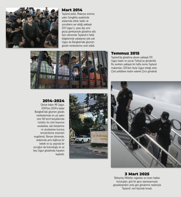 “Geri gönderme” bölümünde, üçüncü ülkeler üzerinden Çin’e iade riskine dikkat çekiliyor. Raporda, 27 Şubat 2025’te Tayland’dan 48 Uygur’un Çin’e gönderildiği ve bunun uluslararası düzeyde geri göndermeme ilkesine aykırı olduğu yönünde eleştiriler bulunduğu aktarılıyor.