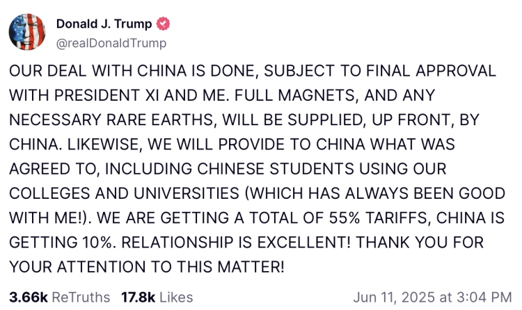 Amerika Birleşik Devletleri (ABD) Başkanı Donald Trump, 11 Haziran 2025 tarihinde Truth Social üzerinden bir açıklama yaptı. Trump, gümrük vergileri konusunda Çin'le anlaşmaya vardıklarını açıkladı.