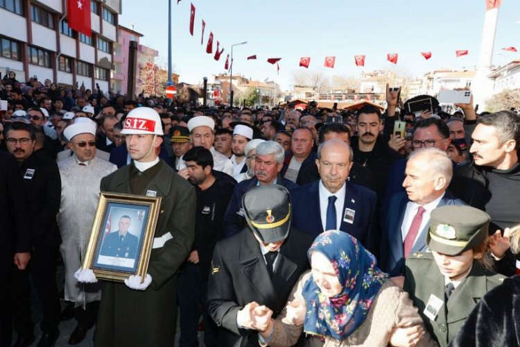 "Şehitler ölmez vatan bölünmez”, “Ne mutlu Türk'üm diyene” sloganları eşliğinde son yolculuğuna uğurlanan şehidi rahmetle anan Cumhurbaşkanı Tatar, Türk halkı ve ailesine başsağlığı diledi.