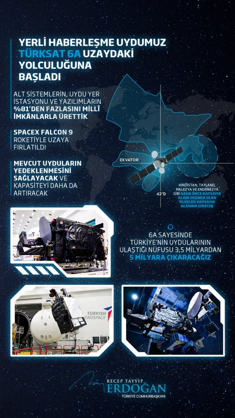Cumhurbaşkanı Erdoğan ise resmî sosyal medya hesabından “Yerli haberleşme uydumuz Türksat 6A’yı az önce uzaya fırlattık. Ülkemiz ve milletimiz açısından yeni bir gurur vesilesine daha hep beraber şahitlik ettik. Ülkemizin uzaydaki istikbali için büyük önem taşıyan 6A projesindeki alt sistemlerin, uydu yer istasyonu ve yazılımların yüzde 81’den fazlasını millî imkânlarla Türkiye olarak kendimiz ürettik. 2,5 sene önce uzaya fırlattığımız 5B uydumuzda olduğu gibi 6A’da da SpaceX firmasının Falcon 9 roketini tercih ettik. Sayın Elon Musk ve SpaceX firmasıyla çeşitli alanlarda tesis ettiğimiz iş birliğinin güçlenmesinden memnuniyet duyuyoruz.” açıklamasında bulundu.
