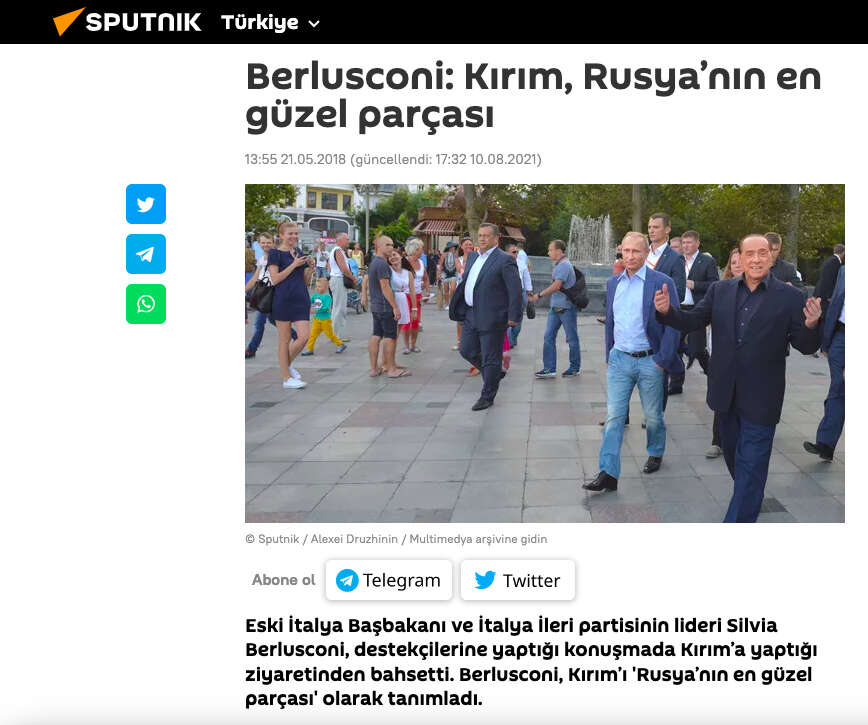 Eski İtalya Başbakanı Silvio Berlusconi, 2015 yılında işgalci Rusya'yı destekleyen ve işgali meşru gösteren akılalmaz açıklamalar yaptı. Berlusconi, sözde referandum sonucunda Kırım'ın Ukrayna'dan silah zoruyla ayrılmasını güya "demokratik" bir seçim olarak nitelendirdi. Eski İtalya başbakanı, Rusya Devlet Başkanı Vladimir Putin'in önde gelen bir siyasi lider olduğunu iddia etti.