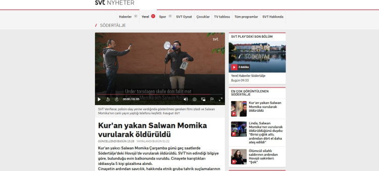 İsveç'te Kur'an-ı Kerim yakarak İslamofobik eylemlerde bulunan Iraklı provokasyoncuSalwan Momika canlı yayın esnasında öldürüldü. Kur'an-ı Kerim yakma provokasyonları ile bilinen Iraklı Salwan Momika'nın İsveç'te vurularak öldürülmesi sosyal medyada yoğun olarak paylaşılmıştı. Daha önce hakkında çok defa "öldü" haberi çıkan şahısla ilgili haberlere şüpheyle yaklaşıldı. Ancak, İsveç'in devlet televizyon kanalı SVT'nin haberi bu iddiaların doğru olduğunu gösterdi. Ayrıca, Anadolu Ajansı teyit hattı da konuyla ilgili ayrıntılı bir haber hazırladı.