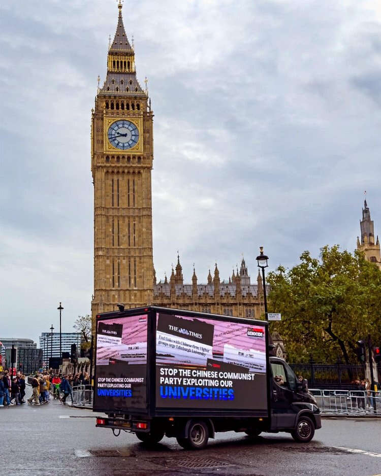 Çin'in Uygur Türkleri başta olmak üzere diğer Türk topluluklarını yapay zeka teknolojisi ile nasıl gözetlediğini, toplama kamparında nasıl işkence ettiğini anlatan LED ekranlı kamyonlar, zirvenin başladığı günden beri Londra'daki merkez caddelerde dolaşıyor.