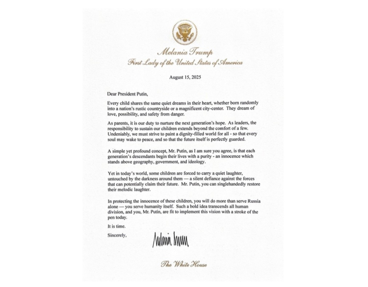 ABD'nin First Lady'si Melania Trump, Alaska görüşmesinden önce Rusya Devlet Başkanı Vladimir Putin'e yazdığı mektubu teslim etti. Mektupta çocukların can güvenliğine dikkat çeken ifadeler yer aldı.