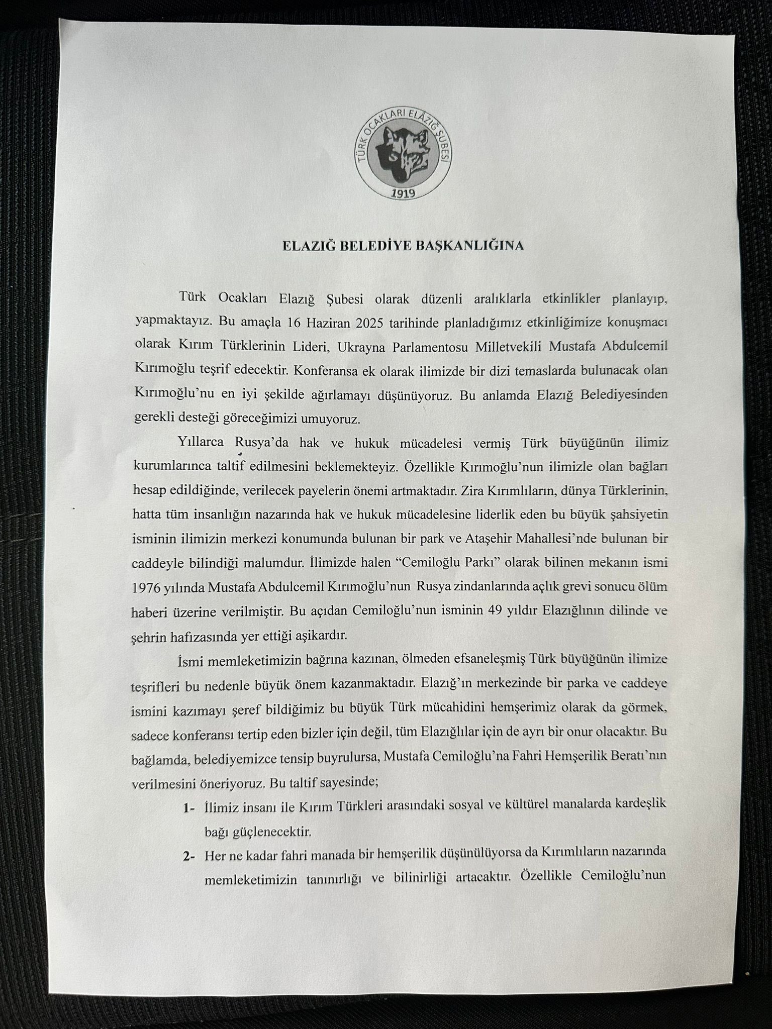 Türk Ocakları Elazığ Şubesinin girişimleri ve talebi neticesinde Elazığ Belediyesi tarafından kendisine "Fahri Hemşehrilik Beratı" verilmesi kararlaştırılan Kırım Tatar halkının millî lideri ve Ukrayna Milletvekili Mustafa Abdülcemil Kırımoğlu, 16 Haziran 2025 Pazartesi günü, Elazığ şehrine ziyarette bulunacak.