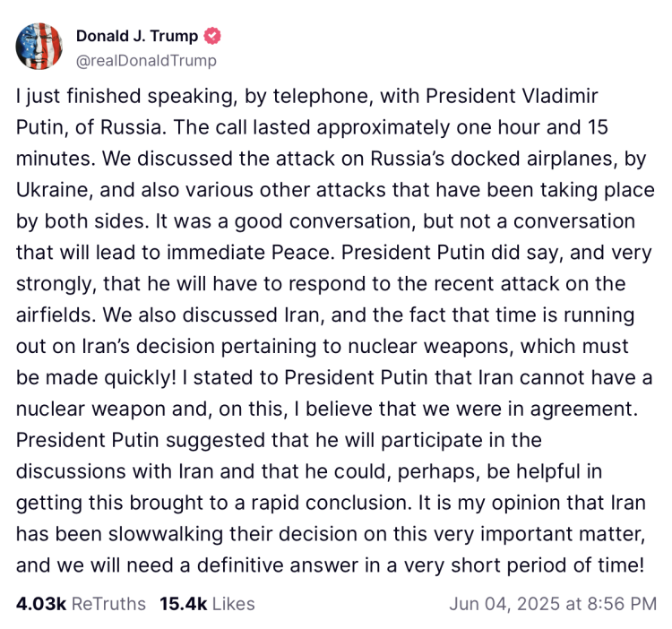 Amerika Birleşik Devletleri (ABD) Başkanı Donald Trump ve Rusya Devlet Başkanı Vladimir Putin, 4 Haziran 2025 tarihinde bir telefon görüşme gerçekleştirdi. Başkan Trump, gerçekleşen görüşme sonrasında Truth Social hesabı üzerinden bir açıklama yaptı.