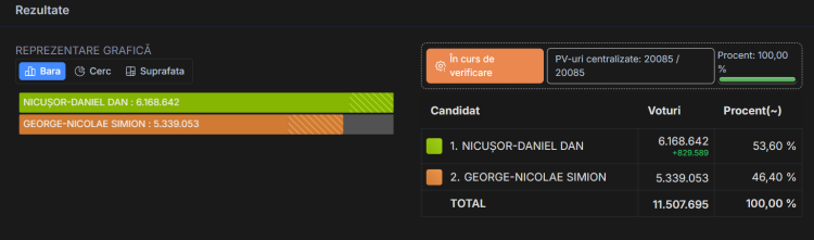 Romanya Merkez Seçim Bürosu (BEC) tarafından açıklanan ve kesin olmayan sonuçlara göre, Dan oyların yüzde 53,60'ını alırken rakibi Simion ise yüzde 46,40'ta kaldı. Yaklaşık 18 milyon seçmenin bulunduğu Romanya'da, 11 milyondan fazla seçmen oy kullandı. İlk turda, Simion yüzde 41, Dan ise yüzde 21 oy almıştı.