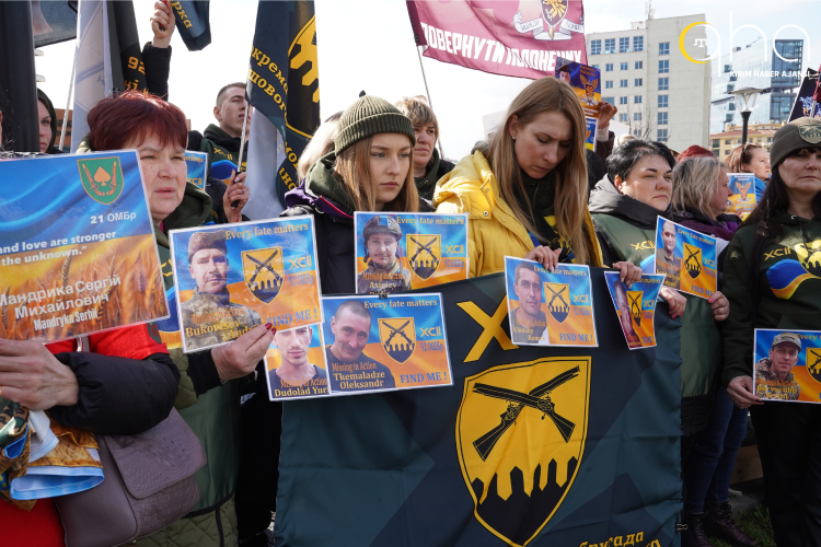 Konuşmaların ardından Rusya’nın Ukrayna’ya karşı sürdürdüğü savaşın 4. yılı arifesinde günün anısına esarette olan Ukrayna kahramanlarının fotoğraflarının olduğu 140 metrelik bir pankart açıldı.