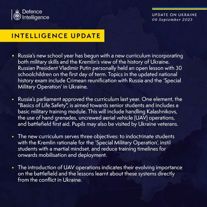 Birleşik Krallık Savunma Bakanlığı tarafından paylaşılan bilgi notuna göre; Rus tarih kitaplarına askeri eğitim, Kremlin'in tarih vizyonu ve savaşın önceki yıllarına ilişkin propaganda ile Ukrayna'ya karşı sözde "özel askeri operasyon" bölümü eklendi.