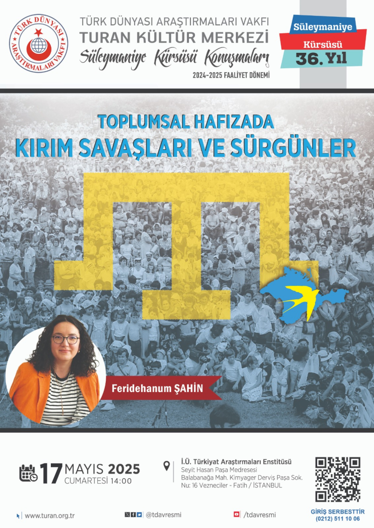 18 Mayıs 1944 Kırım Tatar Sürgünü ve Soykırımı'nın 81. yılı vesilesiyle düzenlenen Feridehanum Şahin'in konuşmacı olacağı "Toplumsal Hafızada Kırım Savaşları ve Sürgünler" programı, İstanbul Üniversitesi Türkiyat Araştırmaları Enstitüsünde tertip edilecek. Konferans 17 Mayıs 2025 tarihinde saat 14.00'te başlayacak.