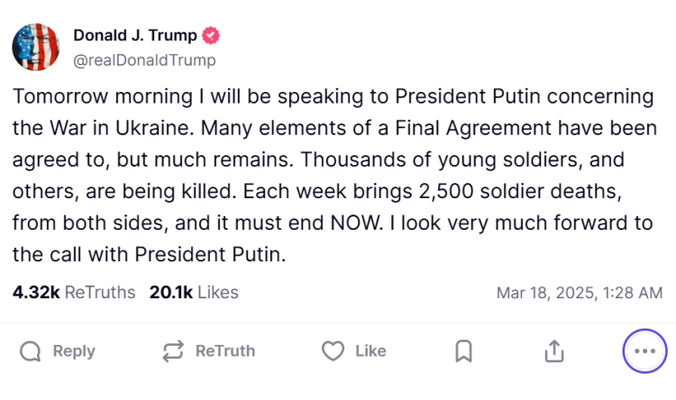Amerika Birleşik Devletleri (ABD) Başkanı Donald Trump, 18 Mart 2025 tarihinde Truth Social'de yaptığı yazılı açıklamada; Rusya'nın Ukrayna'ya karşı sürdürdüğü savaşın sonlanmasına ilişkin barış anlaşmasının birçok unsurunun Rusya Devlet Başkanı Vladimir Putin ile kararlaştırıldığını belirtti.