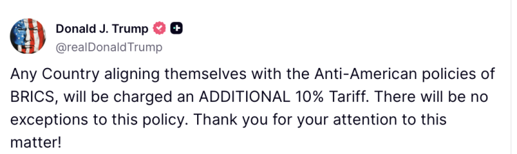 BRICS Zirvesi’nde yayımlanan bildiride İsrail’in ve ABD'nin ticaret politikalarının eleştirilmesi üzerine ABD Başkanı Trump, BRICS’in “anti-Amerikan” politikalarına uyum sağlayan ülkelere ek yüzde 10 gümrük vergisi uygulanacağını açıkladı.