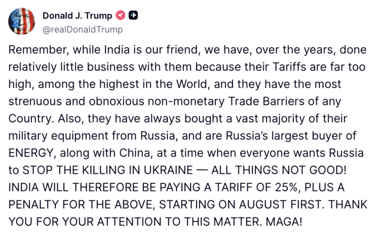 Trump Truht Social platformu üzerinden yaptığı açıklamada, "Unutmayın, Hindistan dostumuz olsa da yıllar boyunca onlarla nispeten az iş yaptık çünkü gümrük vergileri çok yüksek, hatta dünyadaki en yüksek ülkeler arasında ve ülkeler arasında en zorlu ve uygunsuz parasal olmayan ticaret engellerine sahipler. Ayrıca, askerî teçhizatlarının büyük çoğunluğunu her zaman Rusya'dan satın aldılar ve herkesin Rusya'nın Ukrayna'daki ölümleri durdurmasını istediği bir dönemde Çin ile birlikte Rusya'nın en büyük enerji alıcısı konumundalar. Hiçbir şey iyi değil! Bu nedenle Hindistan 1 Ağustos'tan itibaren yüzde 25'lik bir gümrük vergisi ve yukarıdakiler için bir ceza ödeyecektir. Bu konuya gösterdiğiniz ilgi için teşekkür ederiz. MAGA!" ifadelerini kullandı.