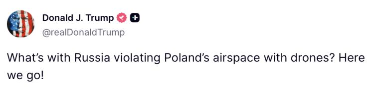 Trump açıklamasında, "Rusya neden Polonya hava sahasını insansız hava araçlarıyla ihlal ediyor? İşte başlıyoruz!" ifadesini kullandı.