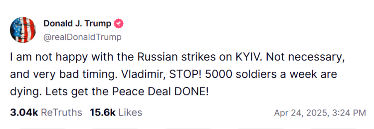 Amerika Birleşik Devletleri (ABD) Başkanı Donald Trump, 23 Nisan’ı 24 Nisan’a bağlayan gece Rusya'nın Ukrayna'nın başkenti Kıyiv'e düzenlediği büyük saldırıya yanıt verdi. Trump, gerçekleşen saldırılardan memnun olmadığını dile getirdi.