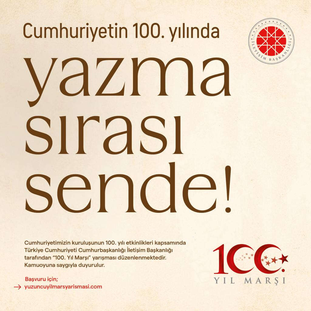 Türkiye Cumhuriyeti Cumhurbaşkanlığı İletişim Başkanlığı tarafından yarışma düzenleniyor. "Cumhuriyetin 100. Yılında Yazma Sırası Sende" isimli yarışmada Cumhuriyetin 100. Yıl Marşı için güftelerini bekleniyor. 29 Aralık'ta başlayan yarışmanın bugün son günü. İletişim Başkanlığından yapılan duyuruda, "Cumhruiyetimizin kuruluşunun 100. yıl etkinlikleri kapsamında Türkiye Cumhuriyeti Cumhurbaşkanlığı İletişim Başkanlığı tarafından "100. Yıl Marşı" yarışması düzenlenmektedir. Kamuoyuna saygıyla duyurulur" ifadeleri kullanıldı.