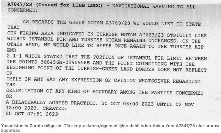 Türkiye, 29 Ekim 2023 tarihinde Zürafa Adası'nın Yunan işgali altındaki bir Türk toprağı olduğuna yönelik A7847/23 sayılı bir resmi duyuruda bulundu. Türkiye'nin, 30 Ekim ile 2 Kasım 2023 tarihleri arasında bölgede S-400 füzeleriyle operasyonel testinin gerçekleştireceği belirtildi.