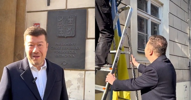 Çek Parlamentosu Başkanı Tomio Okamura, tam kapsamlı savaşın ardından 2022'de destek mesajı içermesiyle parlamento binasına asılan Ukrayna bayrağının Temsilciler Meclisinden indirilmesini emretti. Ukrayna bayrağının indirilme kararı parlamentoda büyük bir yankı uyandırarak, tepkiyle karşılandı. Kararın Çekya'nın Ukrayna'ya yönelik politikasına ters düştüğü belirtildi.