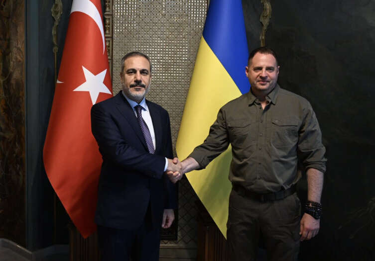 Türkiye Dışişleri Bakanı Hakan Fidan, Ukrayna'nın başkenti Kıyiv'de ilk önce Ukrayna Cumhurbaşkanı Volodımır Zelenskıy, Ukrayna Cumhurbaşkanlığı Ofisi Başkanı Andriy Yermak ve Ukrayna Başbakanı Denis Şmıgal ile bir araya geldi.
