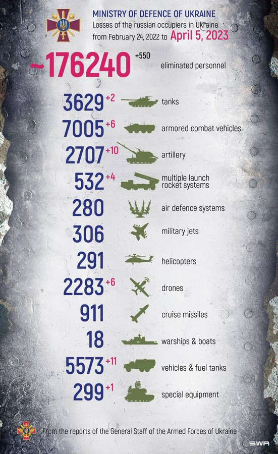 Ukrayna Savunma Bakanlığı, bugün 5 Nisan 2023 tarihi akşam saatlerinde, işgalci Rus ordusuna ait Ka-52 tipi taarruz helikopterinin düşürüldüğünü açıkladı. Ukrayna ordusu, 24 Şubat 2022'den bu yana devam eden çatışmalarda 176 bin 240 işgalci Rus askerini etkisiz hale getirdi. Ayrıca, Rus ordusuna ait toplamda 291 helikopter imha edildi.