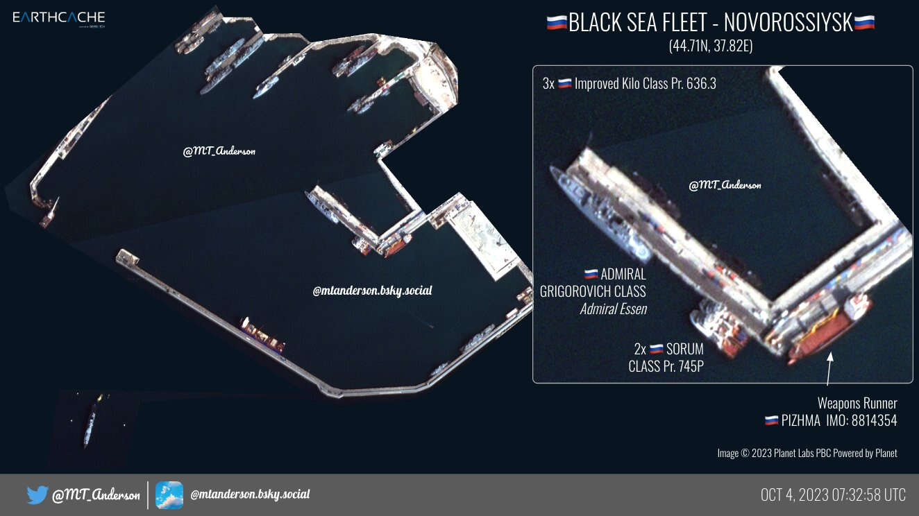 Açık Kaynak İstihbaratı (OSINT) konusunda önemli paylaşımlar yapan MT Anderson, sosyal medyada Rusya’nın Karadeniz bölgesinde bulunan Novorossiysk Limanı'nın uzay görüntülerini paylaştı. Uzmanlara göre, Akyar’dan Novorossiysk Limanı’na “Amiral Essen” ve “Amiral Makarov” fırkateynleri, 3 dizel denizaltısı, 5 büyük çıkarma gemisi ve birkaç tane küçük füze projesi nakledildi.