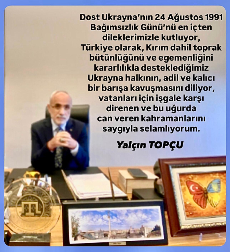 Türkiye Cumhuriyeti Cumhurbaşkanı Başdanışmanı Yalçın Topçu, Ukrayna'nın Bağımsızlık Günü'nün 34. yıl dönümünü kutladı.
