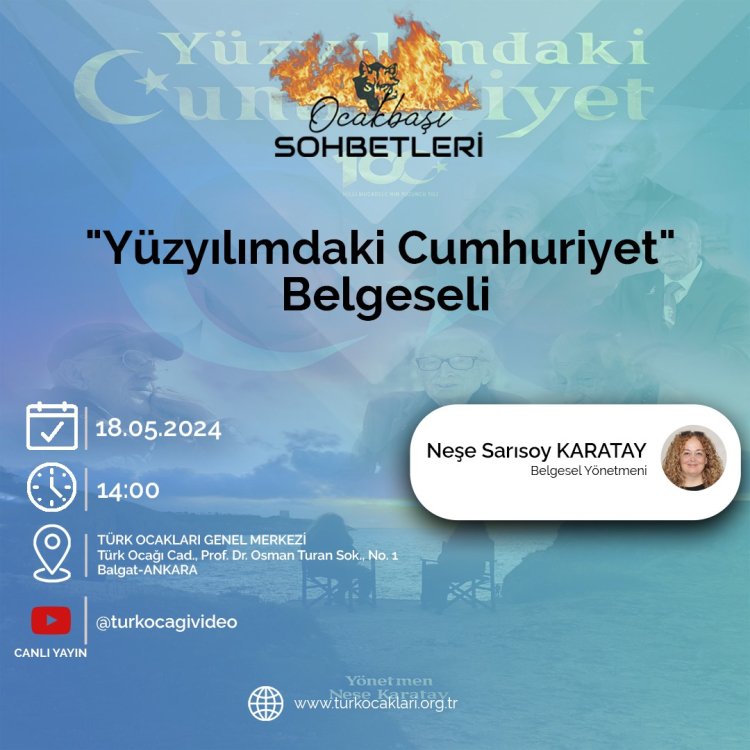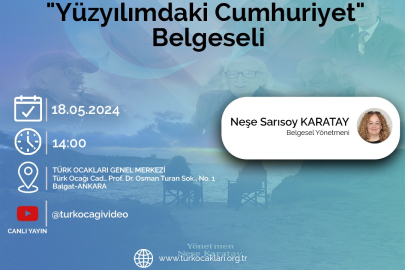 "Osmanlı İmparatorluğunun Doğuşu", "Kırımoğlu: Bir Halkın Mücadelesi" ve "Halil İnalcık Yüzyıllık Çınar" gibi başyapıt niteliğindeki belgesellerin ödüllü yönetmeni, yapımcı ve metin yazarı Neşe Sarısoy Karatay, Türkiye Cumhuriyeti’nin 100. yılına özel olarak hazırladığı bir belgesel hakkında, 18 Mayıs 2024 tarihinde Türk Ocakları Genel Merkezinde söyleşi gerçekleştirecek.