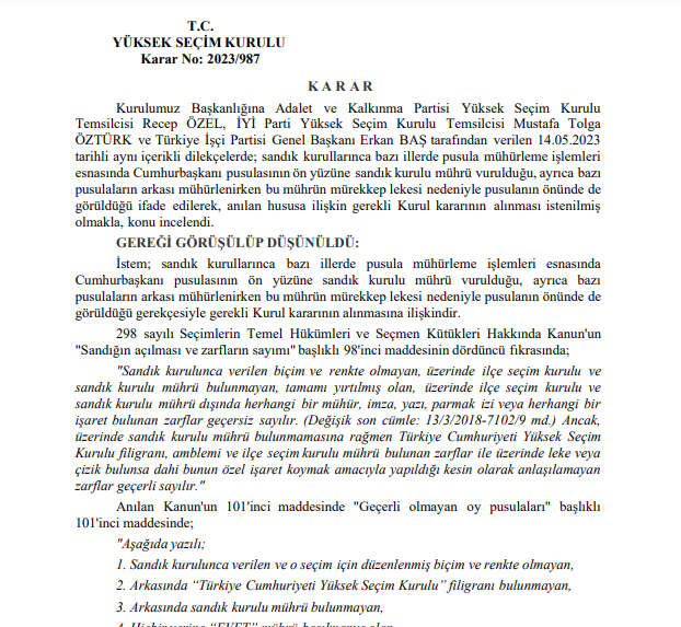 "Kurulumuza intikal ettirilen verilerden bazı sandıklarda cumhurbaşkanı pusulasının ön yüzüne sandık kurulu mührü vurulduğu, ayrıca bazı pusulaların arkası mühürlenirken bu mührün mürekkep lekesi nedeniyle pusulanın önünde de görüldüğü anlaşılmıştır. Söz konusu pusulalar hakkında oy sayım ve döküm esnasında 298 sayılı Kanun’un 98 ve 101’inci uyarınca işlem yapılması gerekmektedir"