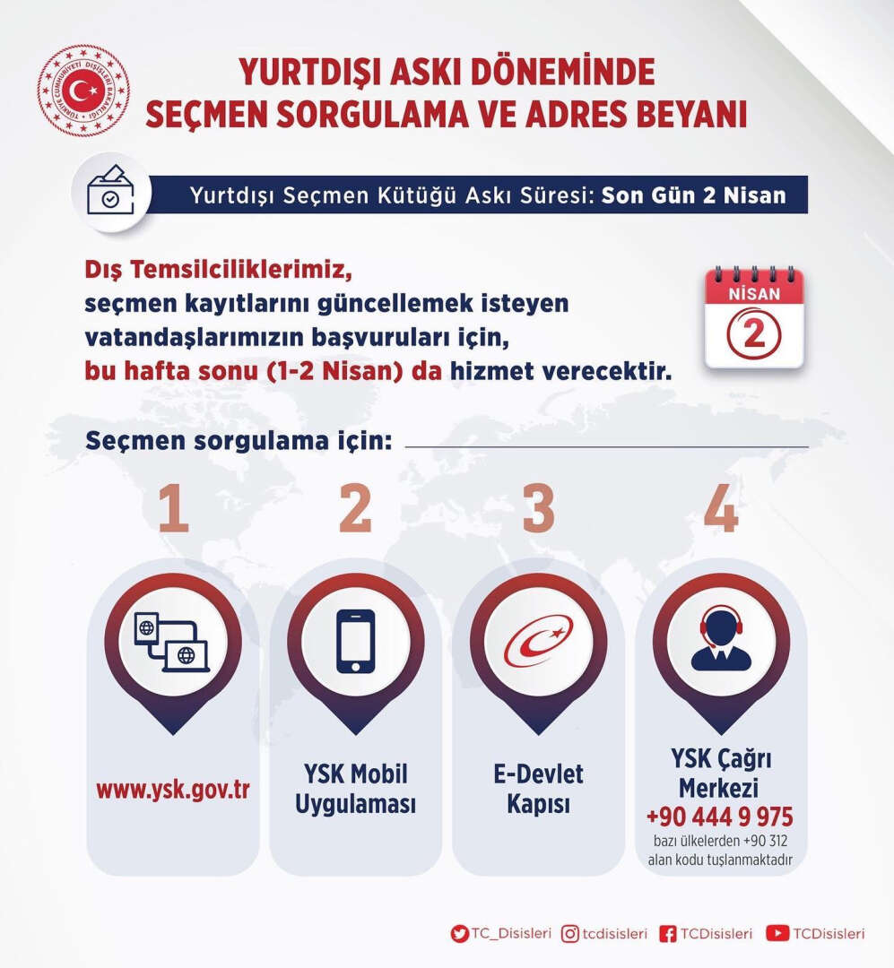 Türkiye saati ile 17:00’ye kadar Türkiye'nin tüm dış temsilciliklerinde başvuru kabul edilecek. Adres beyanında bulunması gereken vatandaşlar, seçmen kaydını oluşturacak.