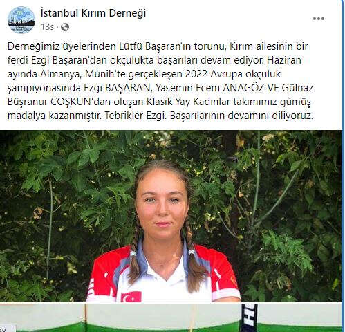 Kırım Derneği İstanbul Şubesi'nin üyelerinden Lütfü Başaran'ın torunu Ezgi Başaran'ın da aralarında bulunduğu Yasemin Ecem Anagöz ve Gülnaz Büşranur Coşkun'ndan oluşan Klasik Yay Kadınlar takımı altın madalya kazandı.