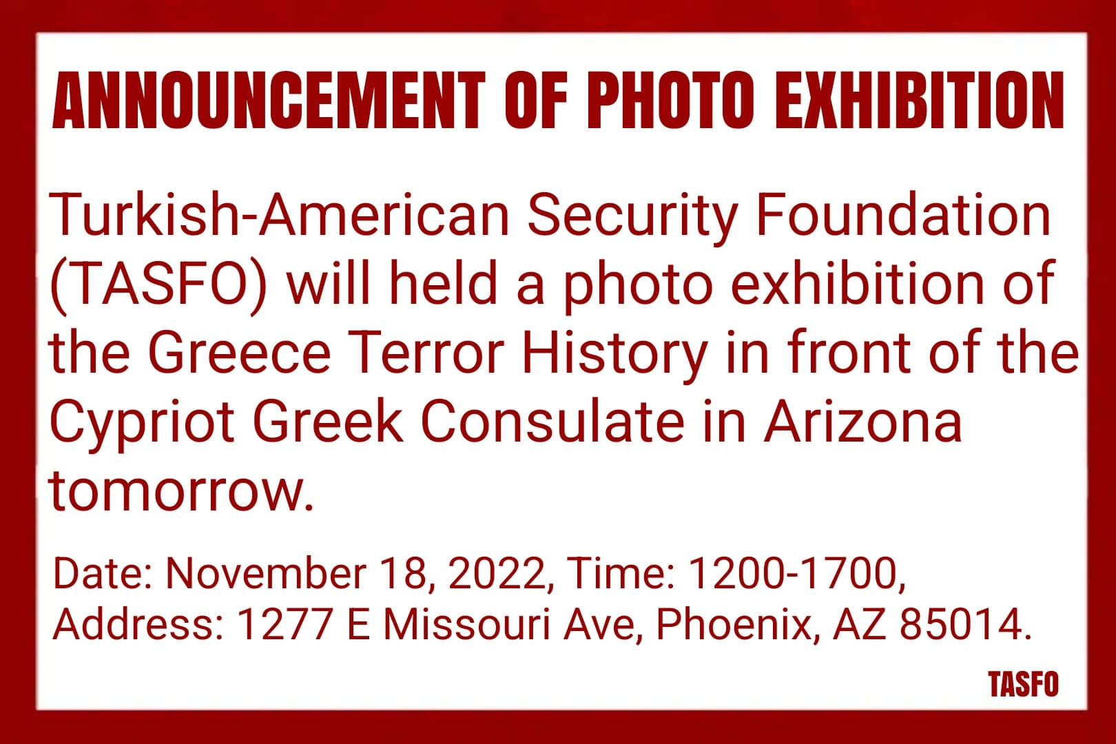 Türk Amerikan Güvenlik Vakfı (TASFO) ABD'de Güney Kıbrıs Rum Yönetimi Arizona Başkonsolosluğu önünde miting düzenleyecek. Mitingde, Arizona Başkonsolosluğu önünde Yunanistan'ın terörü desteklemesi ve Ege Adaları'na işgalci tacizleri hakkında fotoğraflar sergilenecek.