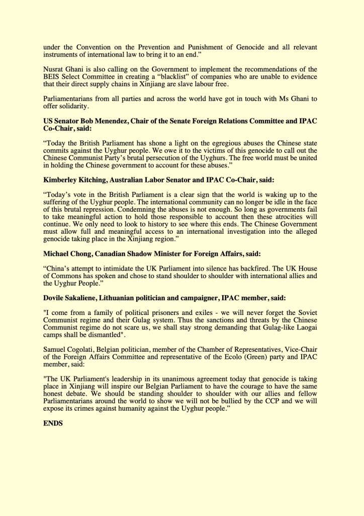 Çin'in Doğu Türkistan'da Uygur Türkleri ve diğer Türk ve Müslüman azınlığa yönelik hak ihlallerini soykırım olarak tanıyan karar tasarısı, bugün Birleşik Krallık Avam Kamarası tarafından oybirliğiyle kabul edildi. Önergede ismi bulunan ve Avam Kamarası'nda kararın geçmesi için yoğun çaba gösteren parlamenter Nusrat Ghani, oylama sonucunu Twitter hesabı üzerinden paylaşarak, "Üç saatlik bir tartışmadan sonra ÇKP'nin işlediği Uygur Soykırımı ile ilgili önerim Birleşik Krallık Avam Kamarası tarafından oybirliğiyle desteklendi. Meslektaşlarına, kampanyacılara ve hayatta kalan cesur Uygurlara minnettarım." ifadelerini kullandı. Ghani, aynı zamanda Çin'in yaptırım uyguladığı Birleşik Krallık vatandaşları arasında yer aldı.