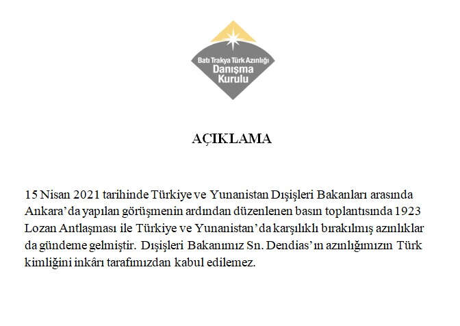 Batı Trakya Türk Azınlığı Danışma Kurulunun resmi Twitter sayfasından bugün yayımlanan duyuruda, "15 Nisan 2021 tarihinde Türkiye ve Yunanistan Dışişleri Bakanları arasında Ankara'da yapılan görüşmenin ardından düzenlenen basın toplantısında 1923 Lozan Anlaşması ile Türkiye ve Yunanistan'da karşılıklı bırakılmış azınlıklar da gündeme gelmiştir. Dışişleri Bakanımız Sayın Dendias'ın azınlığımızın Türk kimliğini inkarı tarafımızdan kabul edilemez." ifadelerine yer verdi.