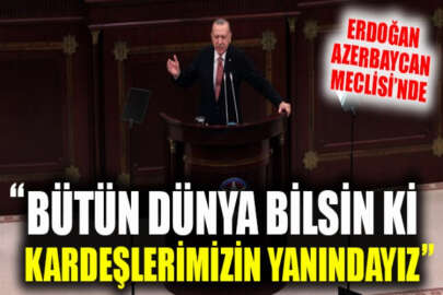 Türkiye Cumhurbaşkanı Recep Tayyip Erdoğan, Azerbaycan Milli Meclisine hitap etti. Türkiye'nin bütün imkanlarıyla Azerbaycan'ın yanında olduğunu vurgulayan Cumhurbaşkanı Erdoğan, "Bütün dünya bilsin ki yarın da yanında yer alacağız." dedi.