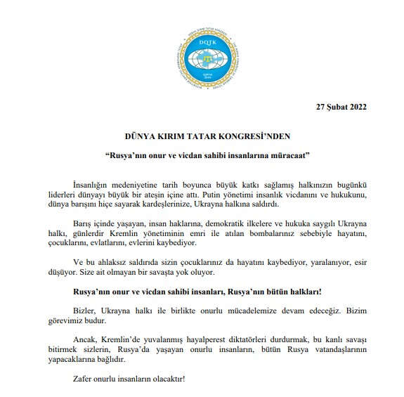 Dünya Kırım Tatar Kongresi, Rusya'nın Ukrayna'yı işgal girişimine ilişkin "Rusya'nın onur ve vicdan sahibi insanların müracaat" başlığıyla Rusya Federasyonu içerisindeki halklara çağrı yaptı. Kongre, Rusya içerisindeki halklara seslenerek, "Rusya’nın onur ve vicdan sahibi insanları, Rusya’nın bütün halkları! Bizler, Ukrayna halkı ile birlikte onurlu mücadelemize devam edeceğiz. Bizim görevimiz budur. Ancak, Kremlin’de yuvalanmış hayalperest diktatörleri durdurmak, bu kanlı savaşı bitirmek sizlerin, Rusya’da yaşayan onurlu insanların, bütün Rusya vatandaşlarının yapacaklarına bağlıdır. Zafer onurlu insanların olacaktır" çağrısını yaptı.