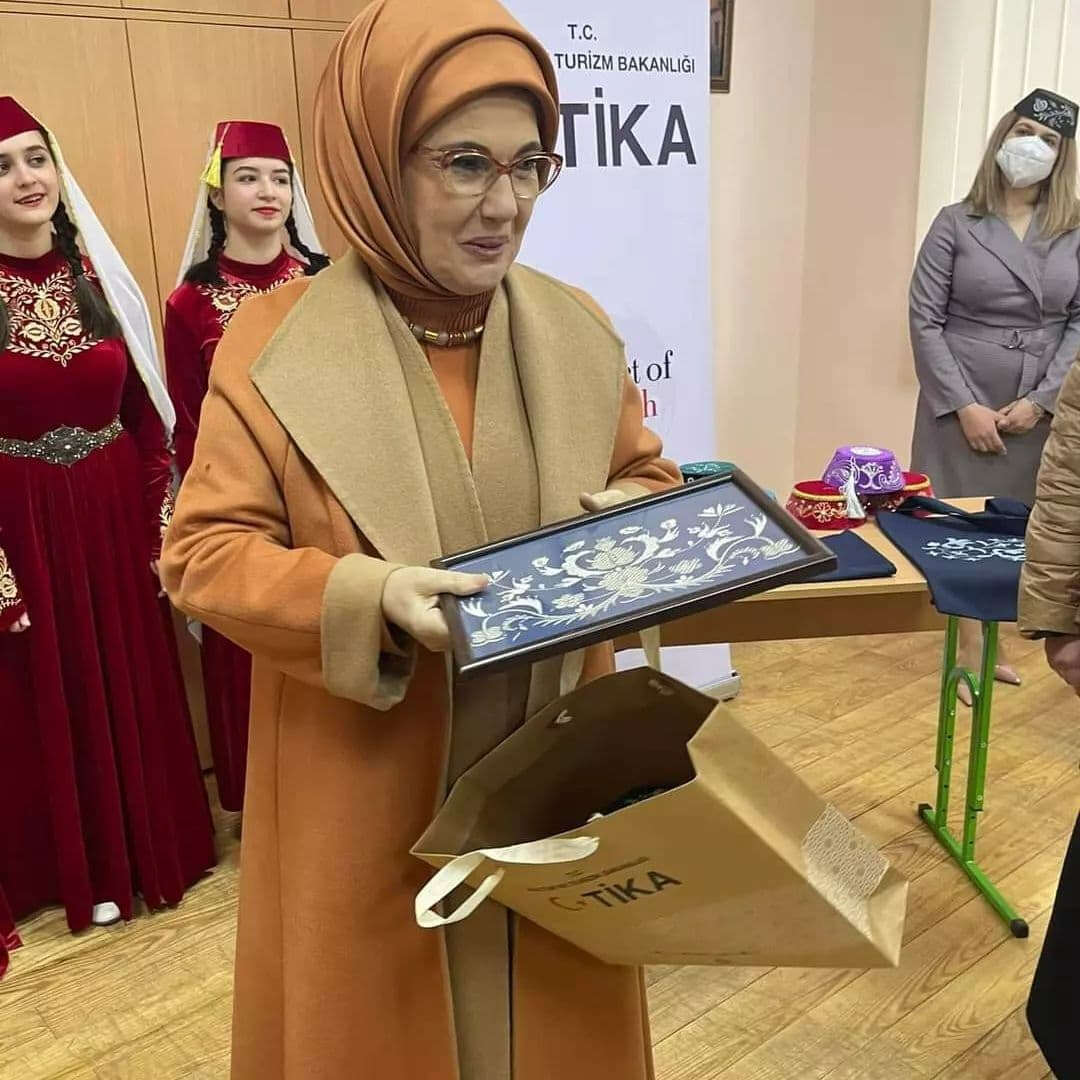 QHA’ya konuşan Kırım Ailesi Koordinatörü Anife Kurtseitova, ziyaret çerçevesinde Emine Erdoğan’ın Kırım Ailesi’nin dersliklerini incelediğini aktararak, “Emine Hanım, Türk İşbirliği ve Koordinasyon Ajansı Başkanlığının (TİKA) desteğiyle Kırım Tatar nakışı kurslarını düzenlediğimiz sınıfı büyük ilgiyle inceledi. Merkezimiz hakkında bilgi verdik ve küçük bir konser düzenledik. Emine hanıma, merkezimizin geçen yıl yayımladığı ‘Kırım ve Kırım Tatarlarının Tarihi’ isimli kitabını ve Kırım Tatar nakışı kursuna katılan kadınların hazırladığı ürünleri hediye ettik.” dedi.