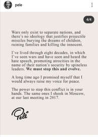 Brezilyalı futbol efsanesi Pele, 1 Haziran 2022'de 2022 Dünya Kupası Avrupa Elemeleri play-off yarı finali çerçevesinde düzenlenen Ukrayna-İskoçya'nın karşılaşmasındanönce Putin'e sosyal medya üzerinden bir açık mektup gönderdi. Sosyal medya hesabından Portekizce ve İngilizce olarak yaptığı paylaşımda, Putin'e çağrıda bulunduğu mektubun görsellerini paylaşan Pele, "Urayna bugün, en azından 90 dakikalığına kendisini derinden sarsmaya devam eden trajediyi unutmaya çalışıyor. Bugünkü maçı fırsat olarak kullanıp bir talepte bulunuyorum. İstilayı durdurun. Süren bu şiddetin kesinlikle hiçbir gerekçesi yok" diye kayadetti.
