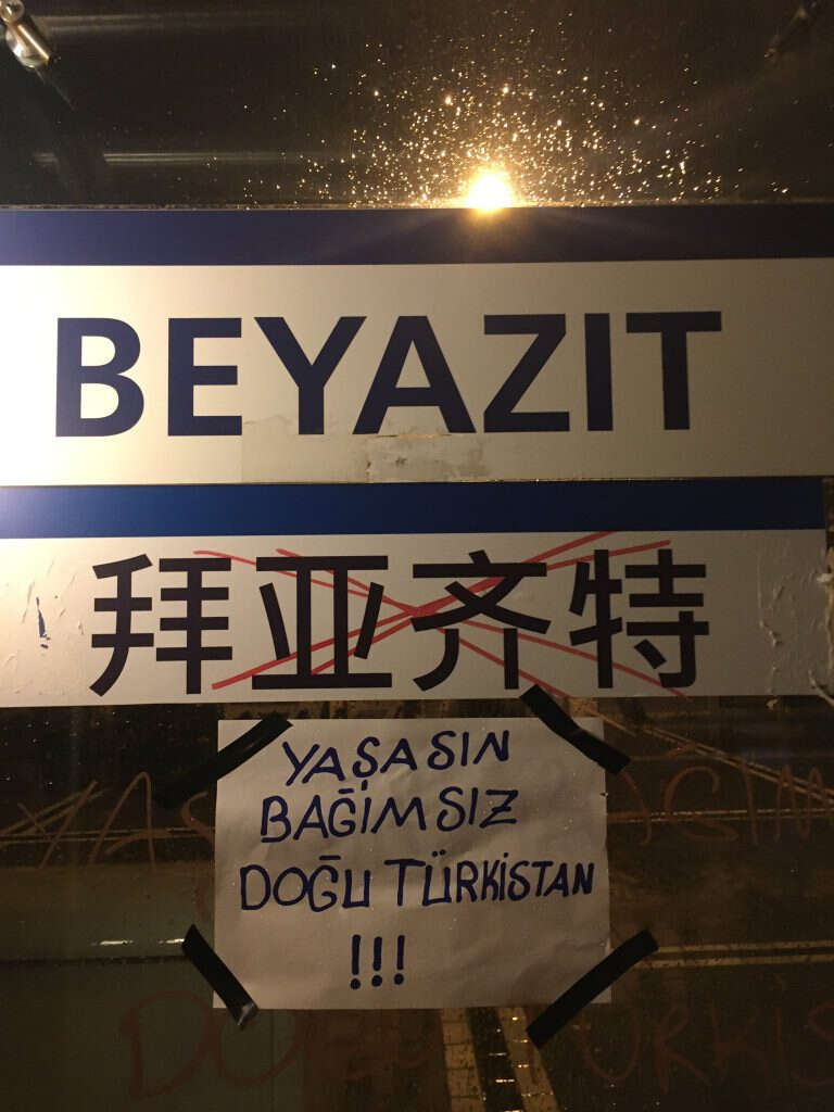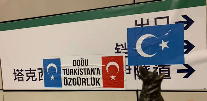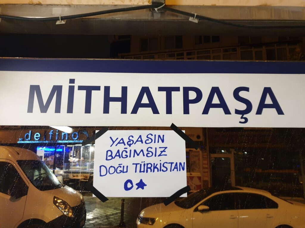 Doğu Türkistan'daki Çin baskılarını dile getirmek için İstanbul'daki toplu ulaşım duraklarına asılan Çince tabelaların üzerine "Yaşasın Bağımsız Doğu Türkistan", "Doğu Türkistan'a özgürlük" yazıları yazılarak Doğu Türkistan ve Türkiye bayrakları yapıştırıldı. Sosyal medyada yazılar ve bayrakların yapıştırıldığı durakların resimleri paylaşıldı.