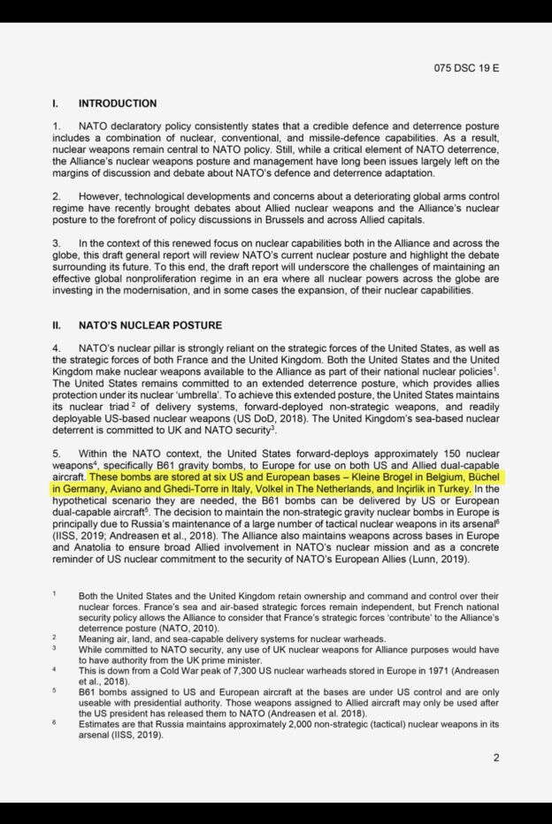 Nükleer silahlarla ilgili raporda; Türkiye'deki İncirlik, Belçika'daki Kleine Brogel, Almanya'daki Büchel, İtalya'daki Aviano ve Ghedi-Torre, Hollanda'daki Volkel askeri üsleri yer aldı.