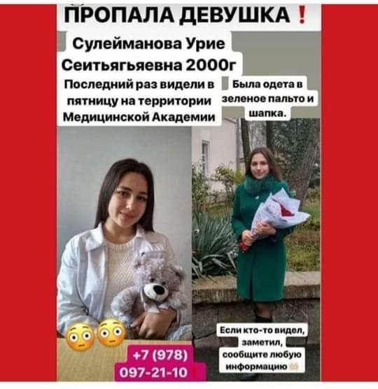 Genç kızın en son eğitim aldığı Yalta Tıp Akademisi’nde görüldüğü ve derslerden sonra genç kızın eve geri dönmediği, ayrıca telefonunun da kapalı olduğu belirtildi.