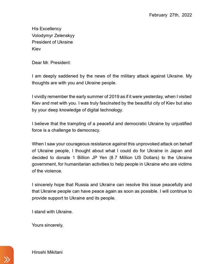 Mektubunu, Ukrayna'ya yönelik askeri saldırıdan dolayı çok üzüldüğünü ifade ederek başlayan başlayan Japon Milyarder Hiroshi Mikitani "Düşüncelerim sizinle ve Ukrayna halkıyla" diyerek devam etti.
