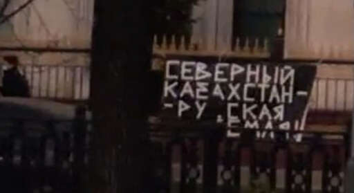 Rusya ve Kazakistan arasındaki kriz devam ederken Moskova'daki Kazakistan Büyükelçiliğinin demirlerine Rus Patriot hareketi üyeleri tarafından “Kuzey Kazakistan – Rusya Toprağıdır” yazan bir pankart asıldı.