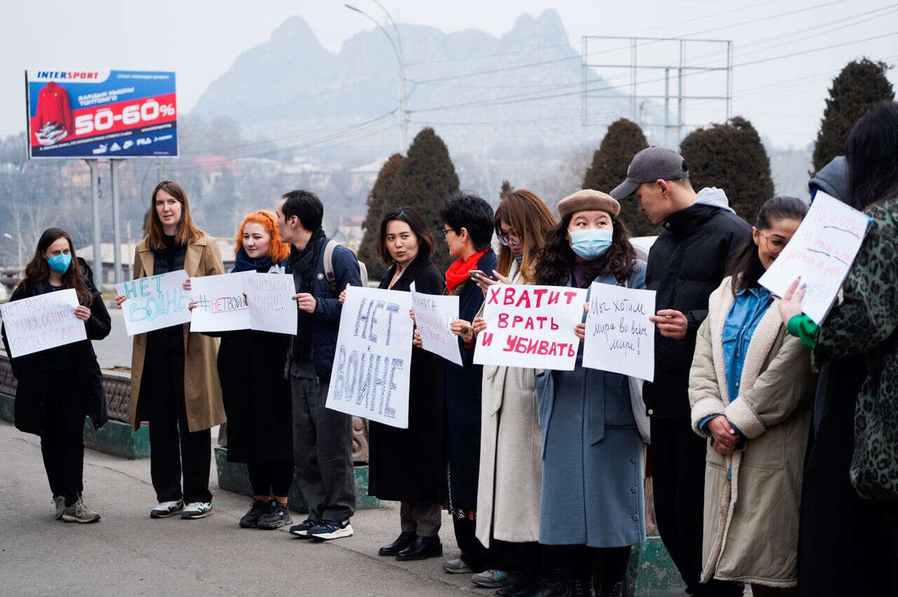 Kırgızistan’ın tarihi şehri Oş kentinde 25 Şubat 2022 tarihinde, Rus asker güçlerinin Ukrayna saldırısını eleştiren bir protesto düzenlendi. Savaş karşıtına karşı yerli halk ve Özbek vatandaşları da katıldı.
