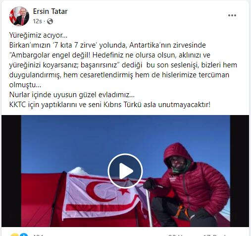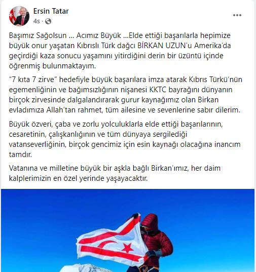 "Başımız Sağolsun … Acımız Büyük …Elde ettiği başarılarla hepimize büyük onur yaşatan Kıbrıslı Türk dağcı Birkan Uzun’u Amerika’da geçirdiği kaza sonucu yaşamını yitirdiğini derin bir üzüntü içinde öğrenmiş bulunmaktayım. '7 kıta 7 zirve'” hedefiyle büyük başarılara imza atarak Kıbrıs Türkü’nün egemenliğinin ve bağımsızlığının nişanesi KKTC bayrağını dünyanın birçok zirvesinde dalgalandırarak gurur kaynağımız olan Birkan evladımıza Allah’tan rahmet, tüm ailesine ve sevenlerine sabır dilerim. Büyük özveri, çaba ve zorlu yolculuklarla elde ettiği başarılarının, cesaretinin, çalışkanlığının ve tüm dünyaya sergilediği vatanseverliğinin, birçok gencimiz için esin kaynağı olacağına inancım tamdır. Vatanına ve milletine büyük bir aşkla bağlı Birkan’ımız, her daim kalplerimizin en özel yerinde yaşayacaktır. Yüreğimiz acıyor… Birkan’ımızın ‘7 kıta 7 zirve’ yolunda, Antartika’nın zirvesinde, 'Ambargolar engel değil! Hedefiniz ne olursa olsun, aklınızı ve yüreğinizi koyarsanız; başarırsınız' dediği bu son seslenişi, bizleri hem duygulandırmış, hem cesaretlendirmiş hem de hislerimize tercüman olmuştu… Nurlar içinde uyusun güzel evladımız…KKTC için yaptıklarını ve seni Kıbrıs Türkü asla unutmayacaktır!"