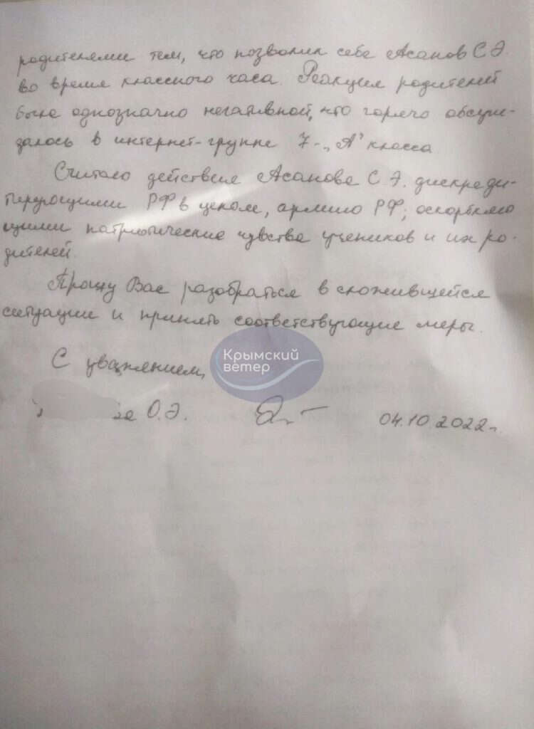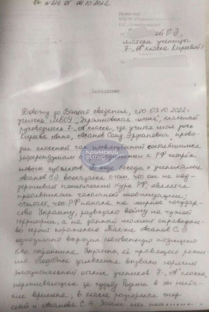 Rusya tarafından işgal edilen Kırım’ın Akmescit (Simferopol) bölgesinde bulunan Yanı Sarabuz (Ukromnoye) köyü sakini bir kadın, Kırım Tatar öğretmen Said Asanov’u polise ispiyonladı. Kadının polise yazdığı ihbar mektubuna göre, matematik öğretmeni ayrıca 7. sınıfta sınıf öğretmenliği yapan Kırım Tatarı Said Asanov, bir derste çocuklara Rusya’nın Ukrayna’ya saldırarak savaşı başlattığını ve şu an da yenildiğini anlattı. Ayrıca ispiyoncu kişi, Asanov’un Kırımlı erkeklerin Rus ordusuna alınmasına karşı olduğunu ve Ukrayna’yı desteklediğini belirtti.