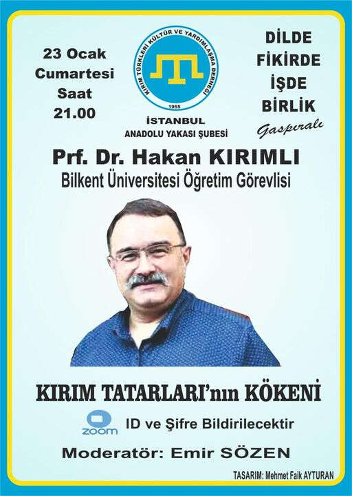 Kırım Derneği İstanbul Anadolu Yakası Şubesinin gerçekleştirilmeye devam ettiği çevrimiçi konferanslarında bu hafta, "Kırım Tatarlarının Kökeni" konuşulacak. Prof. Dr. Hakan Kırımlı'nın anlatıcı olarak katılacağı program, 23 Ocak 2021 akşamı saat 21.00'de gerçekleştirilecek.