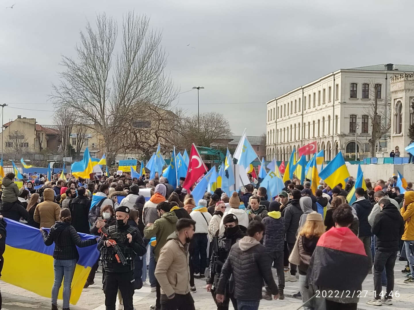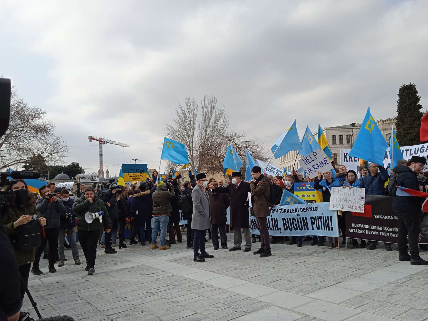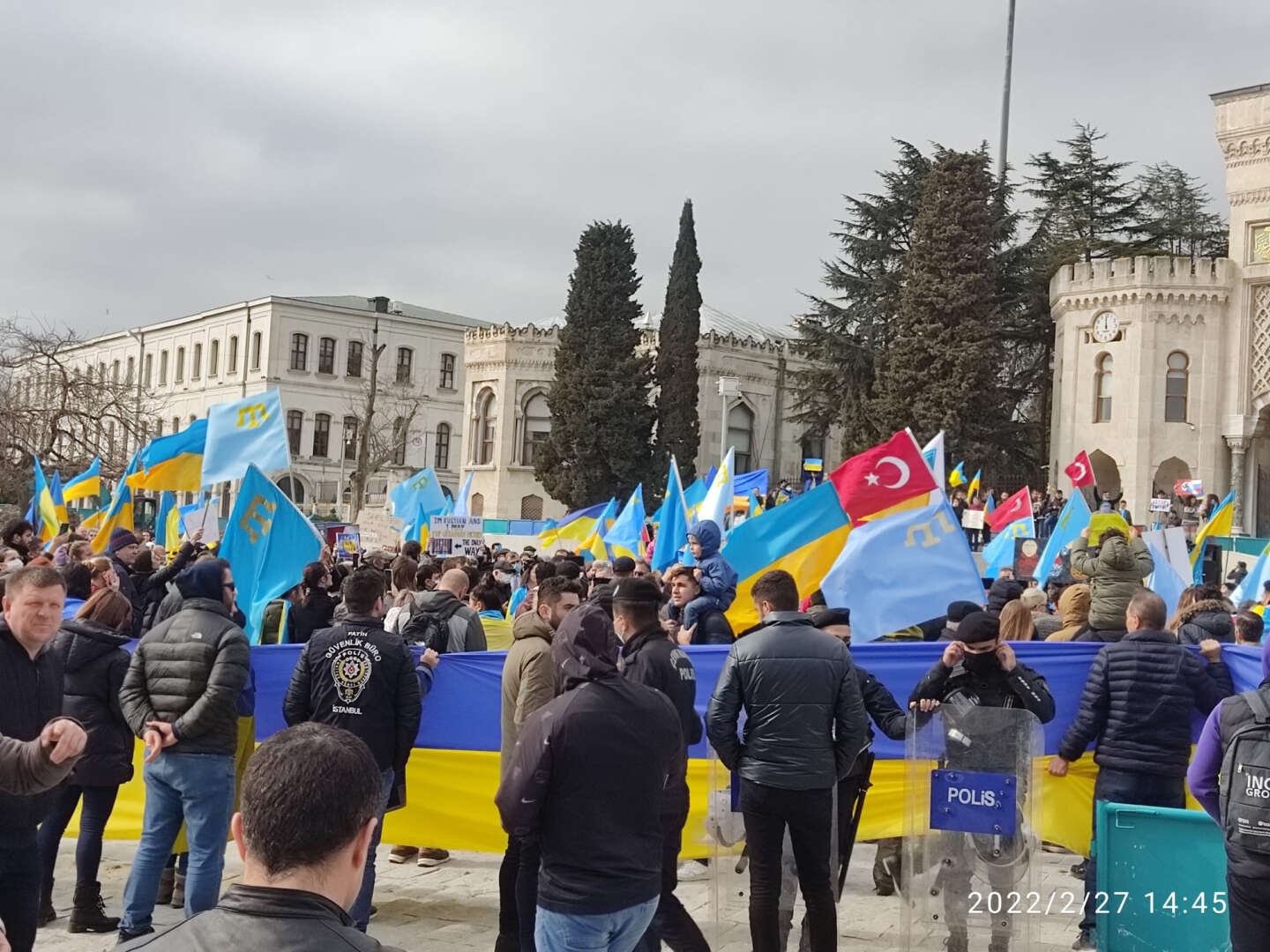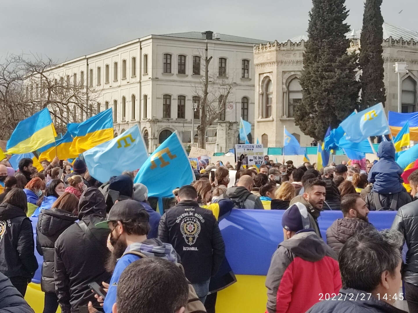 Beyazıt Meydanında bugün gerçekleştirilen protestoya, işgalci Rusya karşıtı pankartları ile Ukrayna, Türkiye ve Kırım Tatar bayraklarının taşındı, duyarlı vatandaşlar mitinge yoğun ilgi gösterdi.
